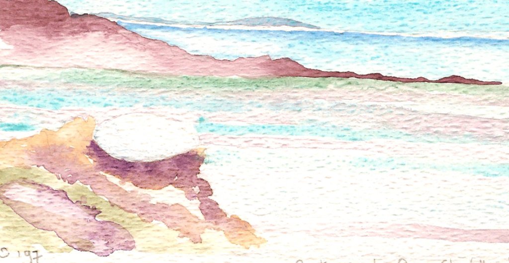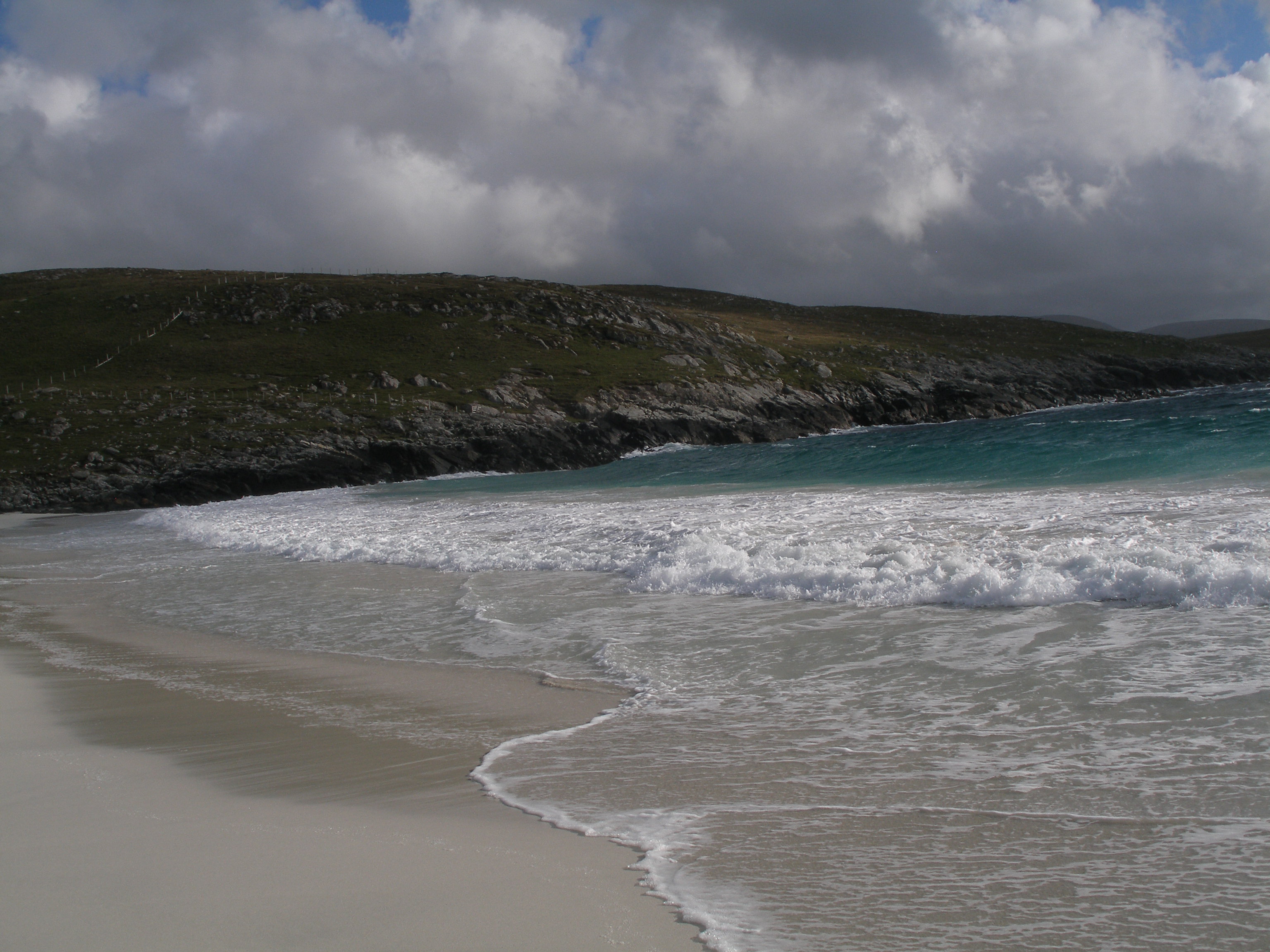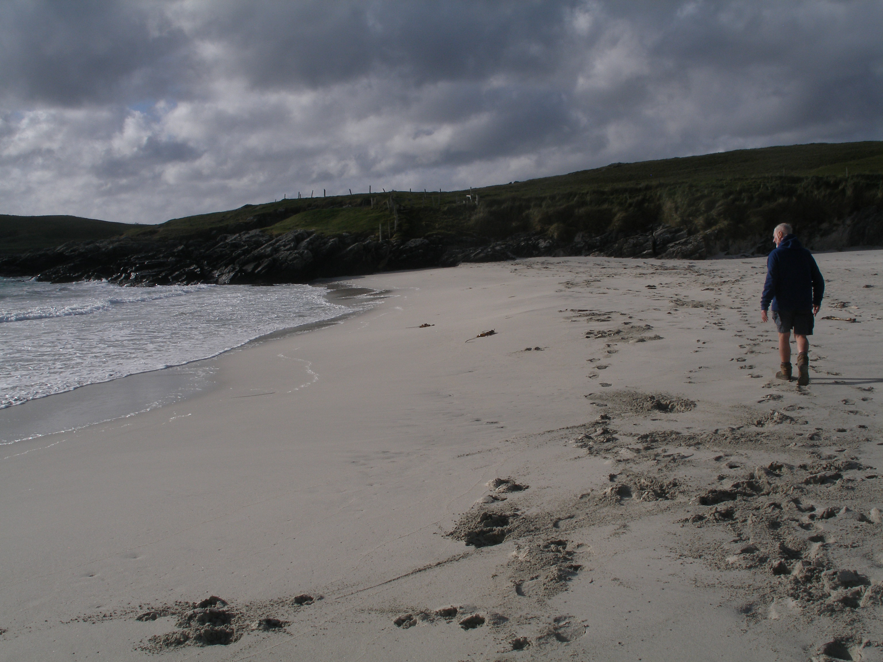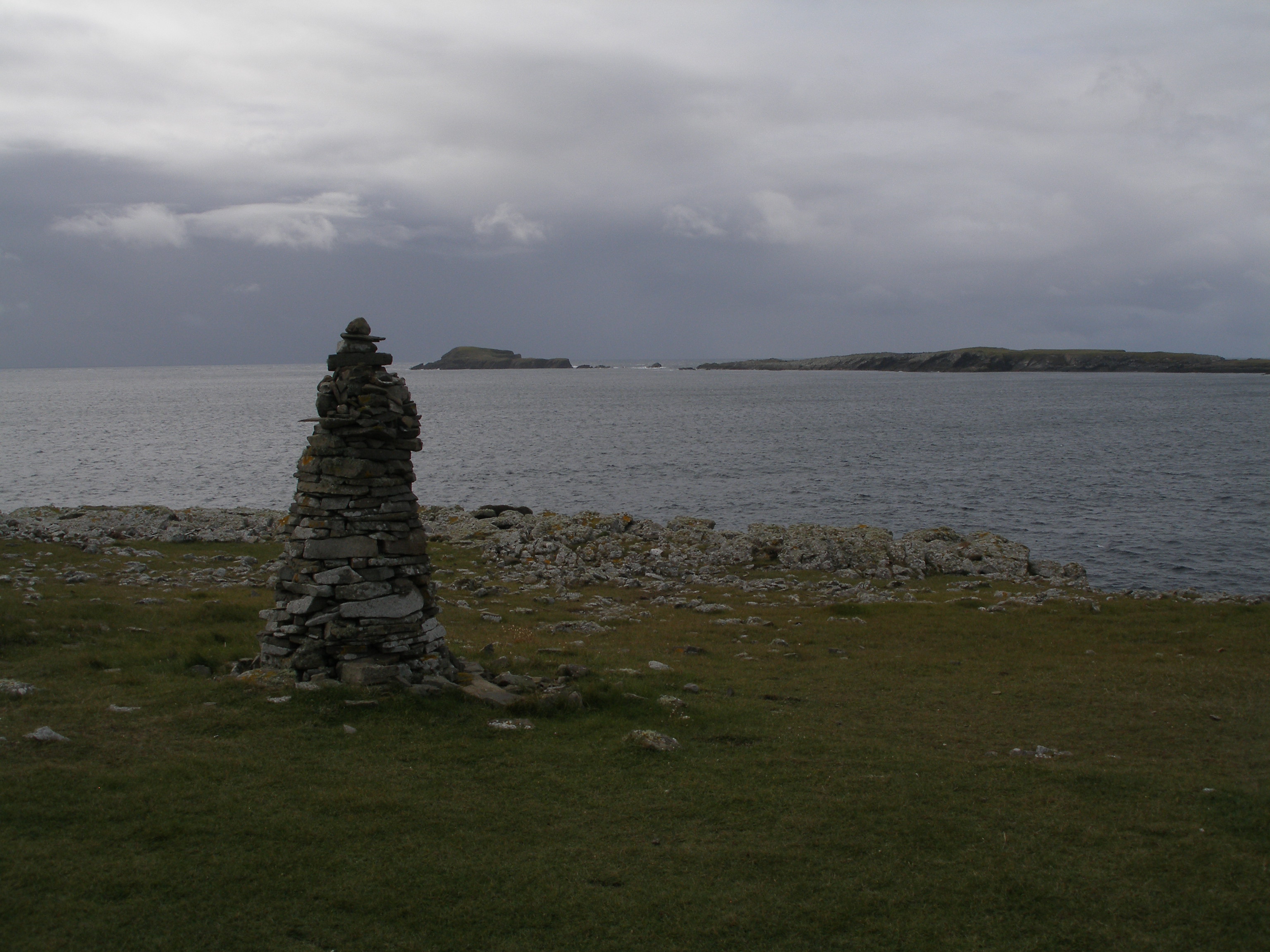 In brilliant sunshine John (yet again in another Fair Isle buttoned vest to be admired and photographed) drove us to St Ninian’s isthmus where we hiked in amazement across beautiful pale sands onto the little island with its ruined chapel where a wooden box of a horde of silver had been discovered by a local boy. Sculptured puffin holes dotted the sand banks: their occupants already out to sea a full month since.
