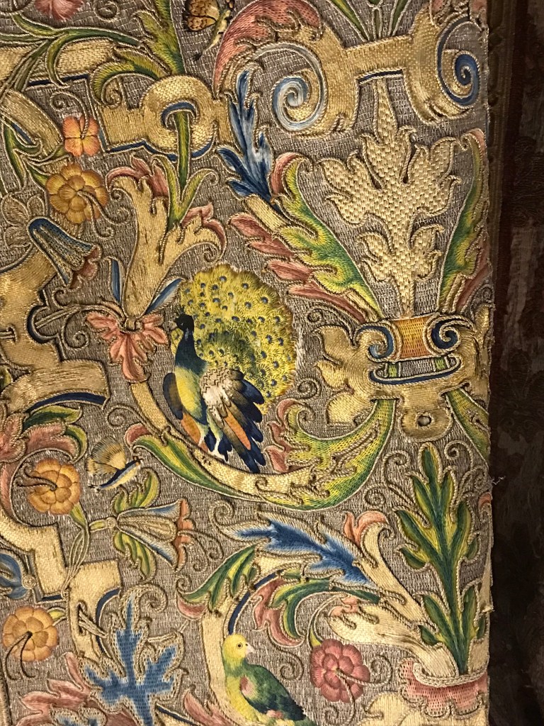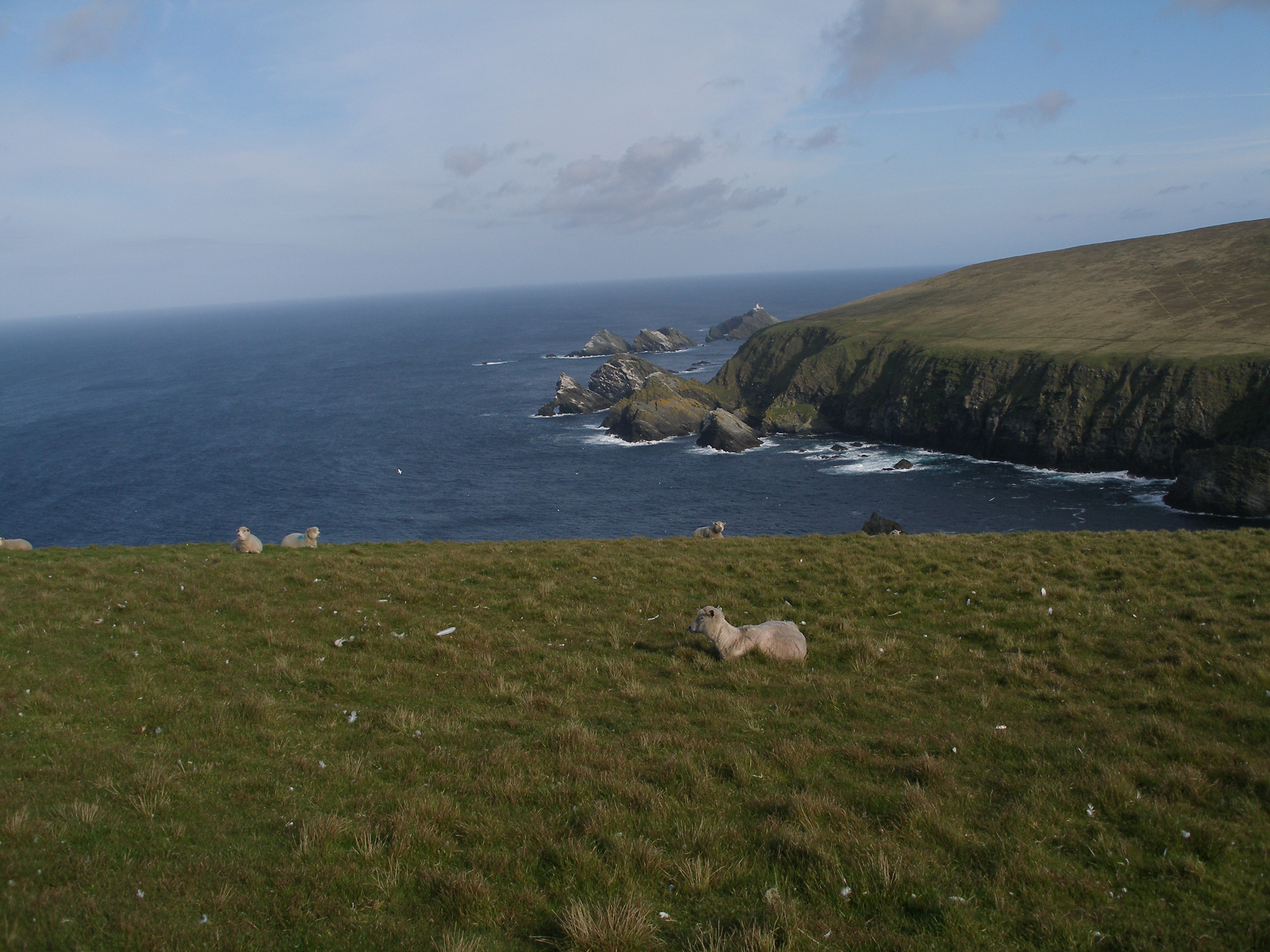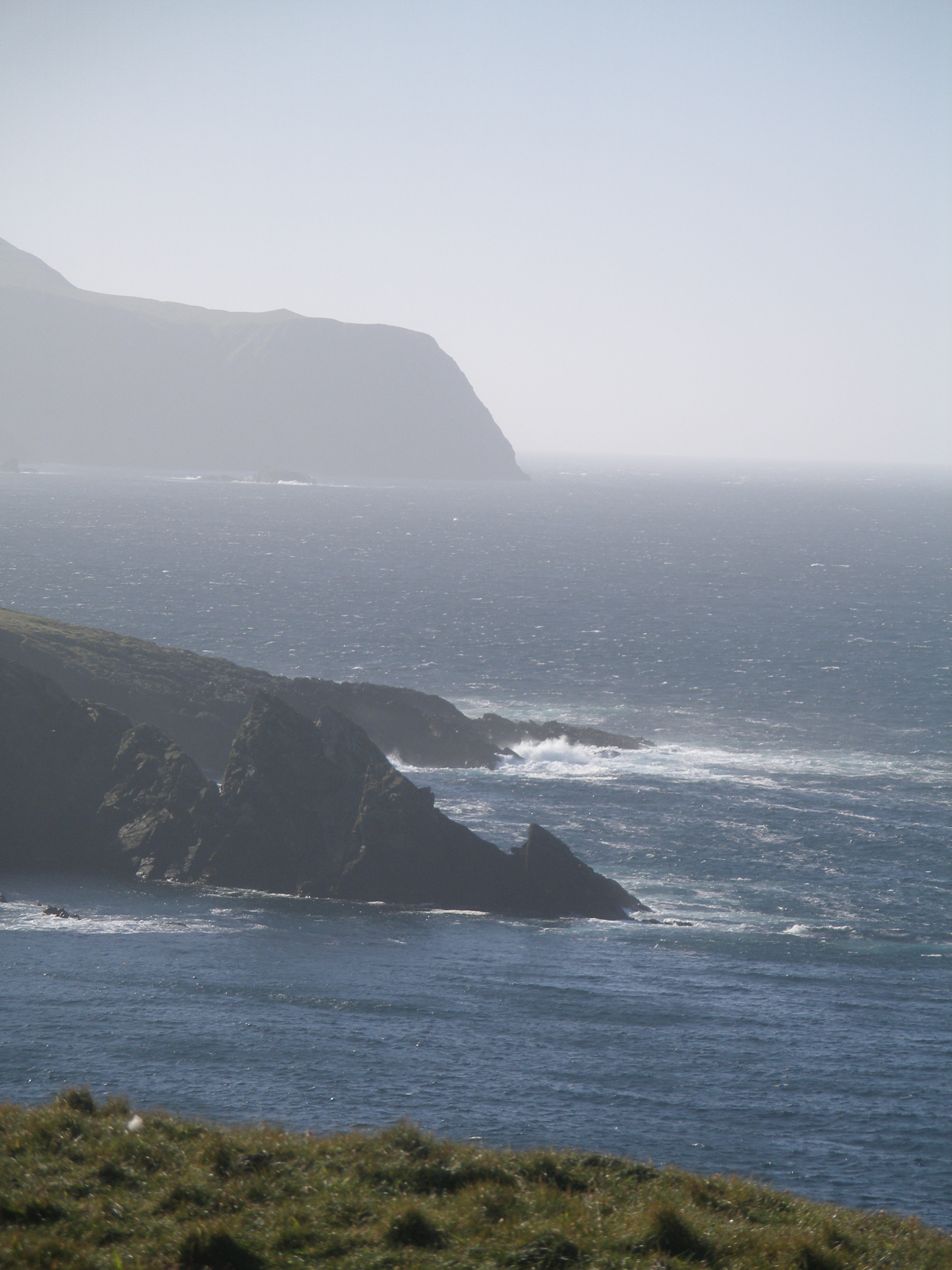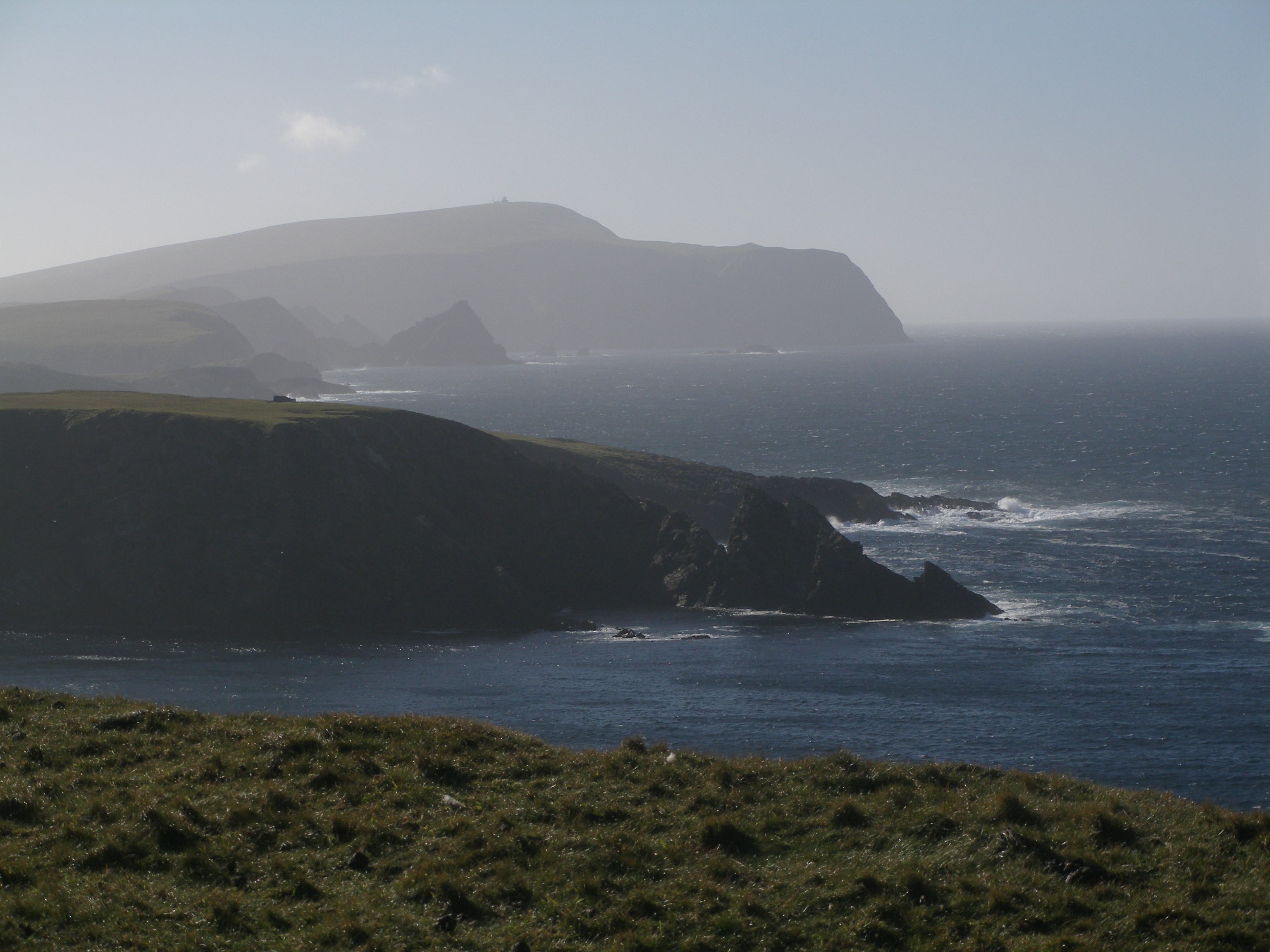 The lure of these isolated islands? They offered a unique combination: a pilgrims’ path for an Orcadian patron saint; rugged coast lines filled with wildlife (gannets, fulmars, otters, seals and whales); more than five thousand years of ancient history (from Neolithic villages to Vikings) plus an opportunity to delve into the timeless traditions of local textiles. Having read that the cobweb-fine wool from the neck of the indigenous Shetland flocks could be knitted into a shawl so fine it could be drawn through a wedding ring, and learning that this signature lace-work was said to have been influenced by marooned survivors of the Spanish Armada and lace mantillas, I was keen to study their designs in depth, as well as the signature multi-coloured patterns of the nearby Fair Isle islands, situated between Orkney and Shetland. Prior to my departure, I had intentionally not read Anne Cleeve’s detective novels set on Shetland, nor watched any of the BBC tv series of the same name, as I wanted to form my own impressions of that remote group of islands and not allow another’s vision of its landscape and people to shade my view or colour my words.