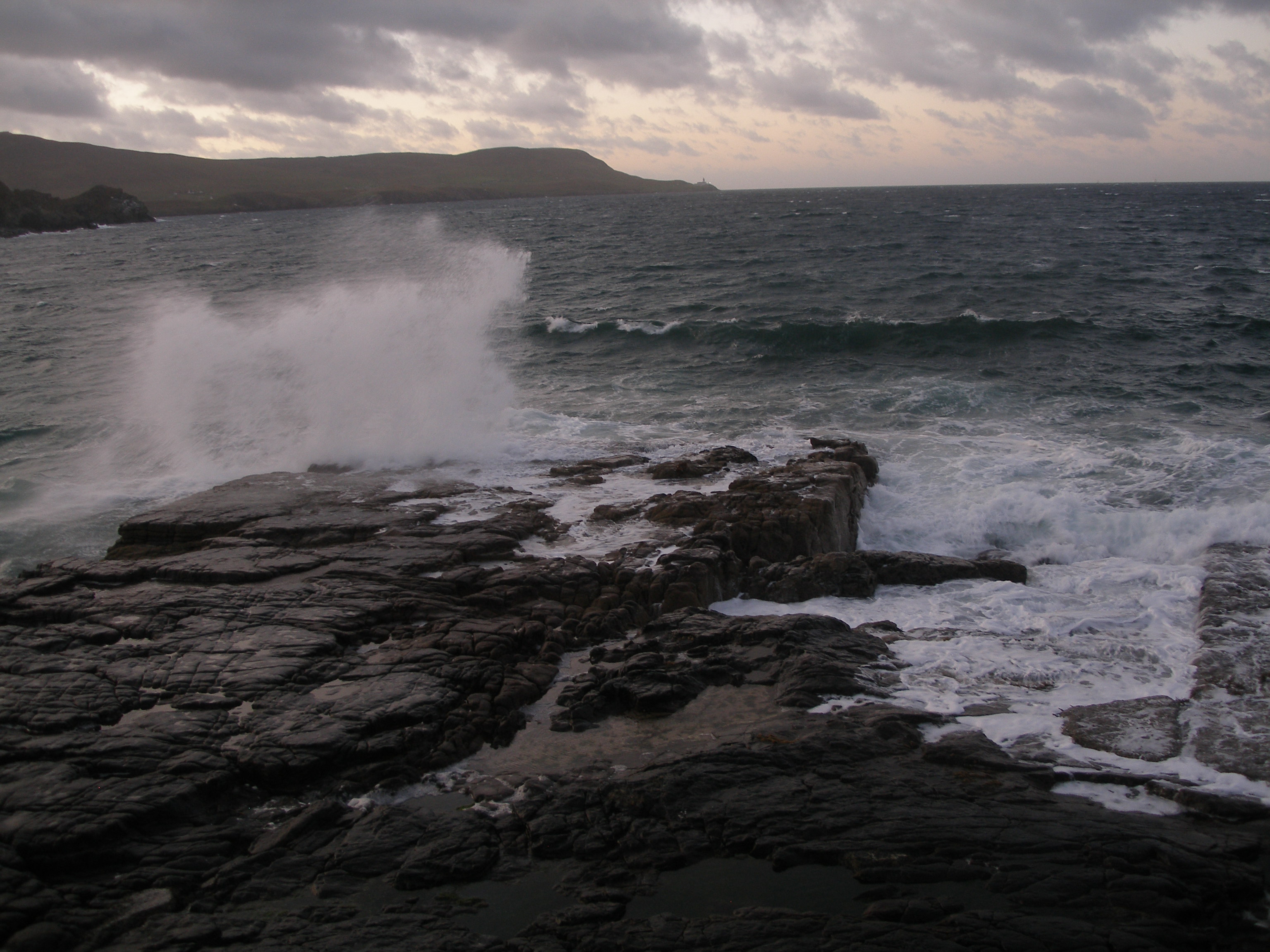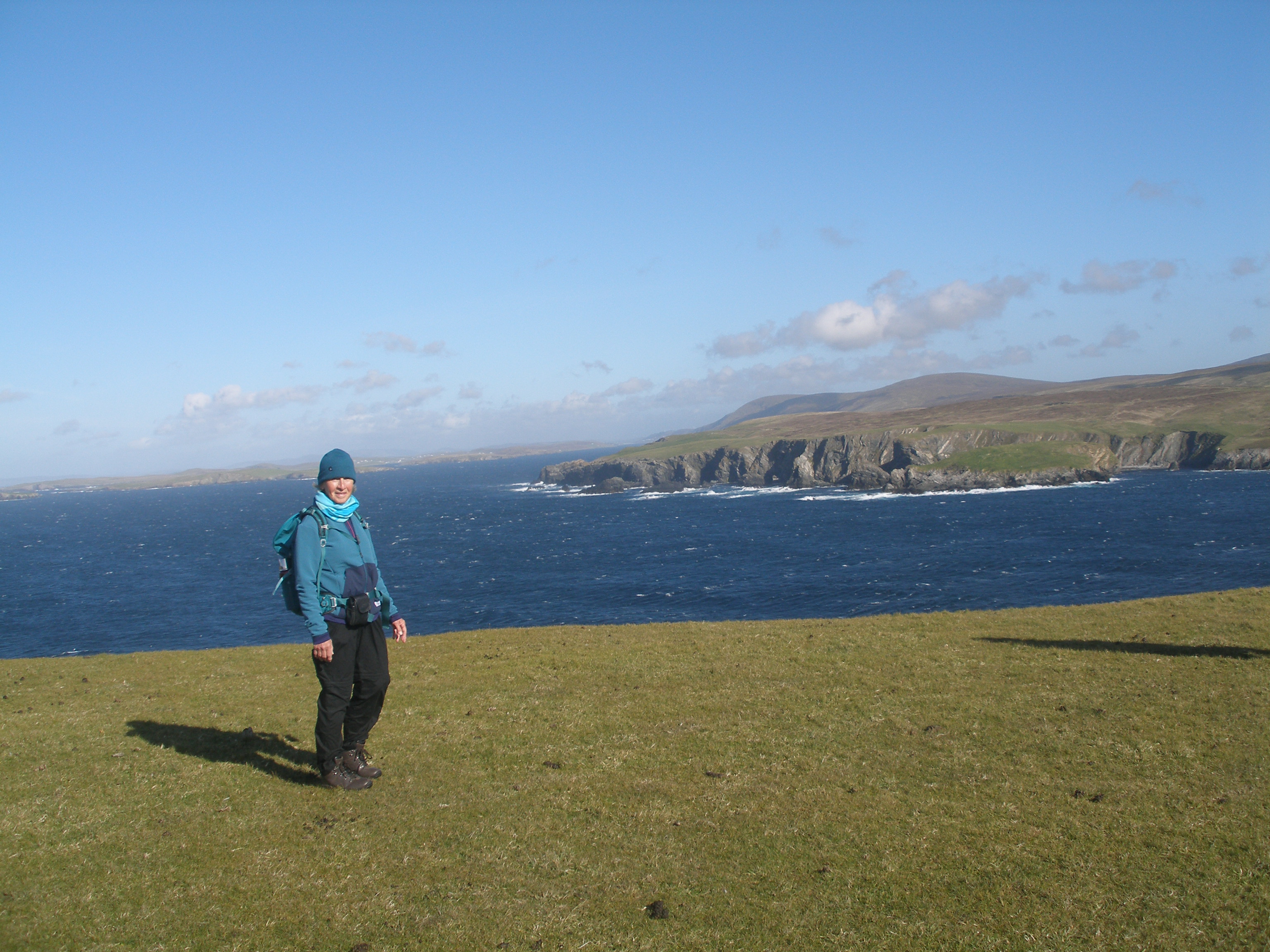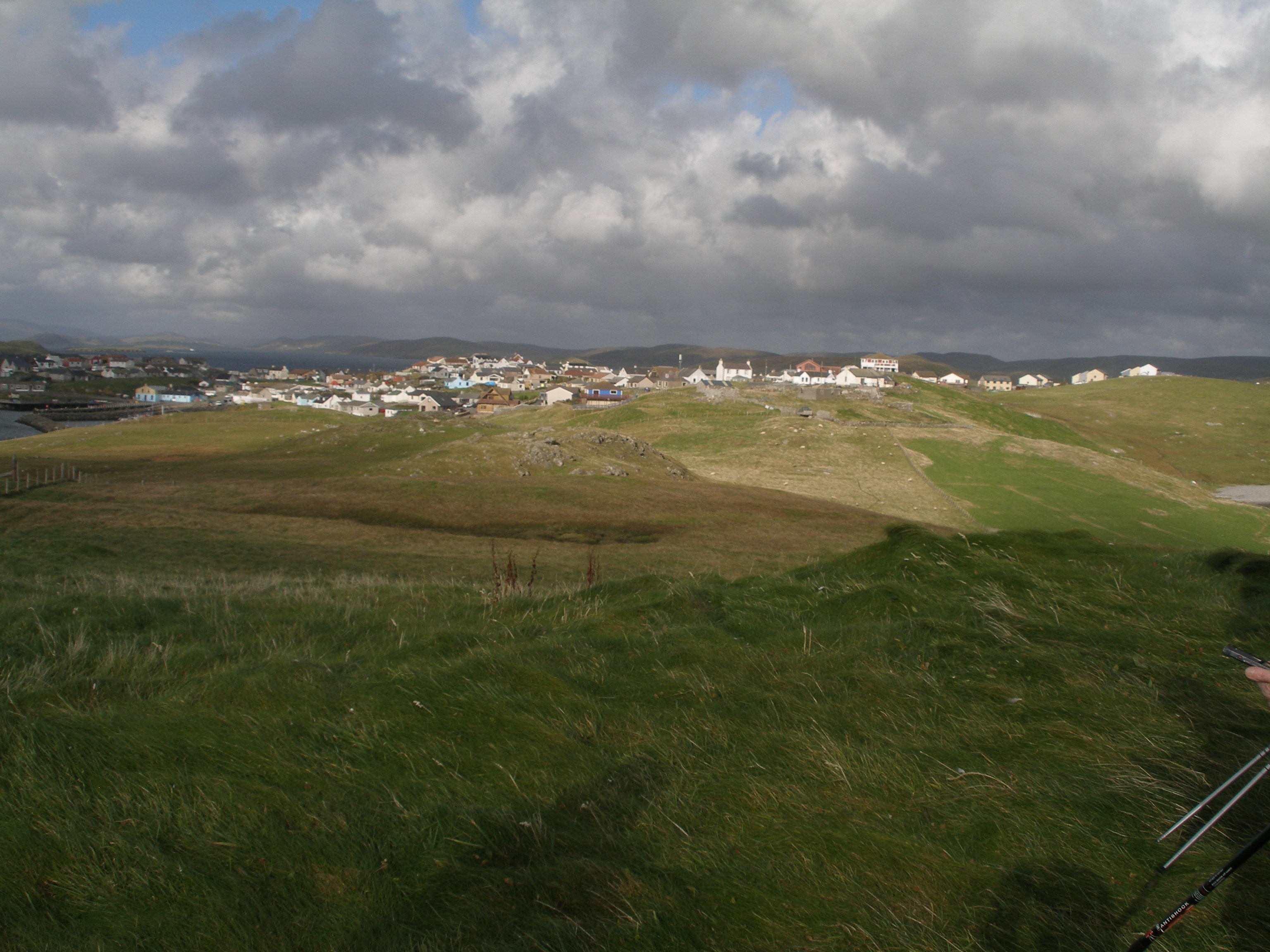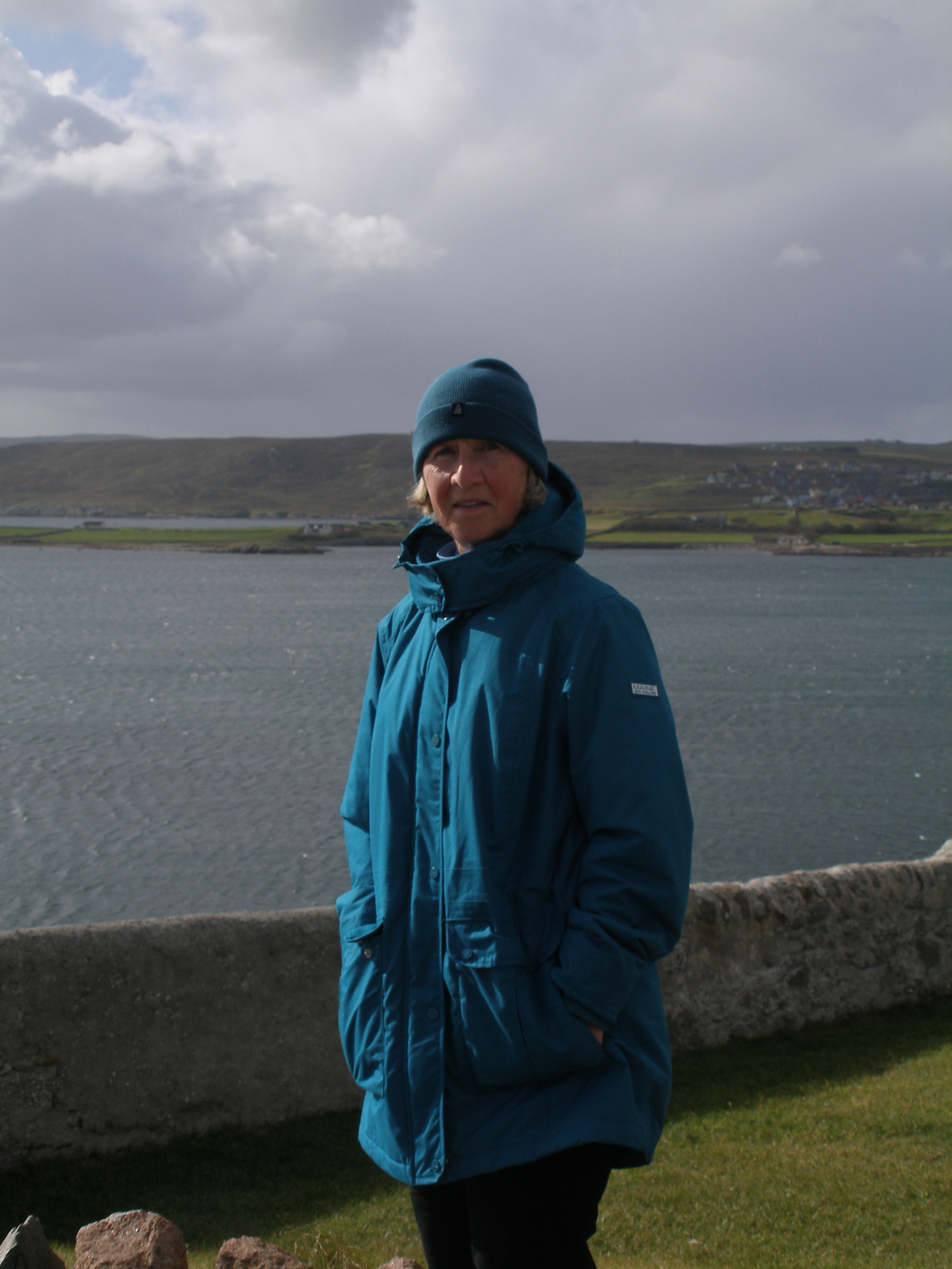 Our final afternoon’s hike took us from the south west end of the old capital across Meal Beach and along the headland, looping back to the harbor. Pointing the minibus in the direction of our hotel, John shared some of his early life growing up in Unst and how the oil riches, tourism, the wind farms – and the forthcoming space rocket launch-site – have brought a basic prosperity to the harsh lives of the Shetlanders. I reflected in the silence that followed, that to blossom in this bleak, remote, beautiful place a person would have to be both resilient and practical, possessing a pioneer’s strength of spirit. Orkney with its softer landscape and richer agricultural land, located much nearer to the mainland of Scotland, seemed to me to offer a gentler prospective lifestyle than Shetland. The shortness of daylight in the mid-winter months presents both a physical and mental challenge to all those living and working on both groups of islands. Only the uniquely resilient who openly embraced being an active human cog in a community wheel, I decided, could hope to flourish.
