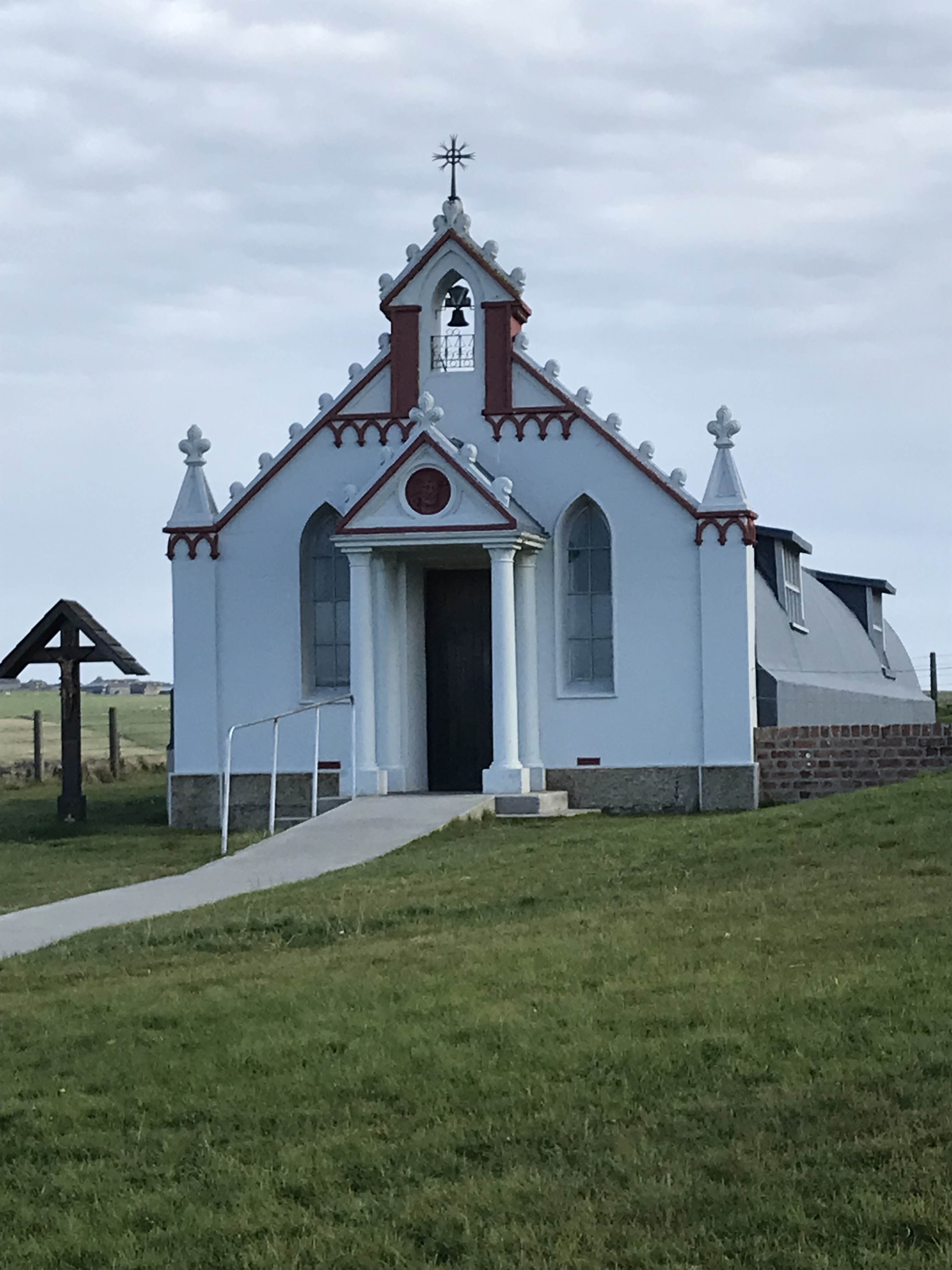 Back into the mini bus to visit the Italian Chapel created from two Second World War Andersen shelters by Italian prisoners of war who ingeniously decorated the entirety with trompe d’œil into an ornate Roman Catholic place of worship.