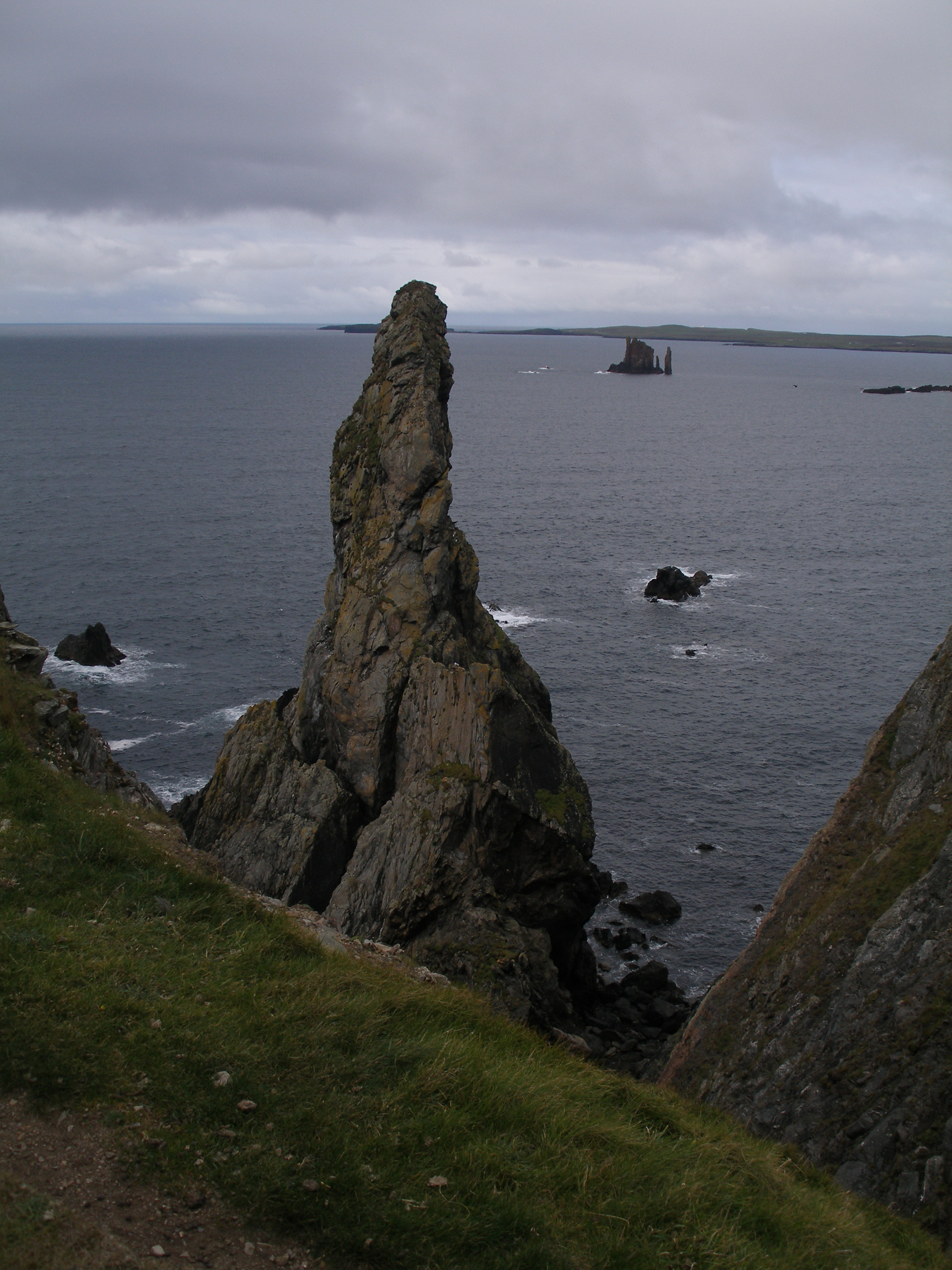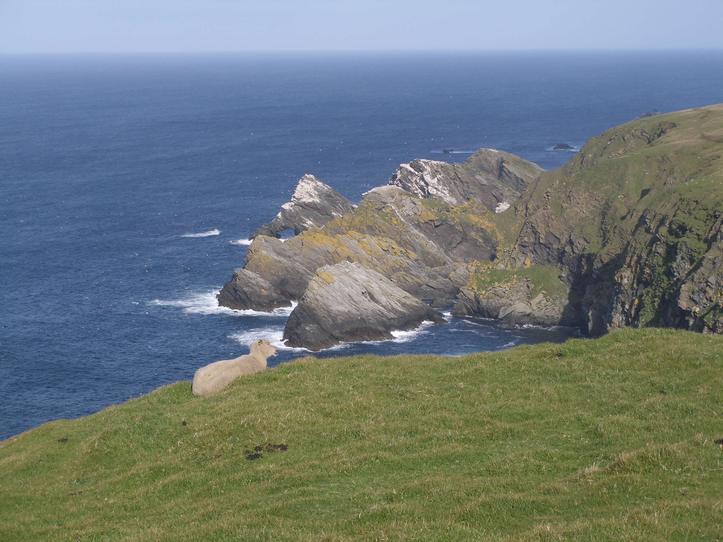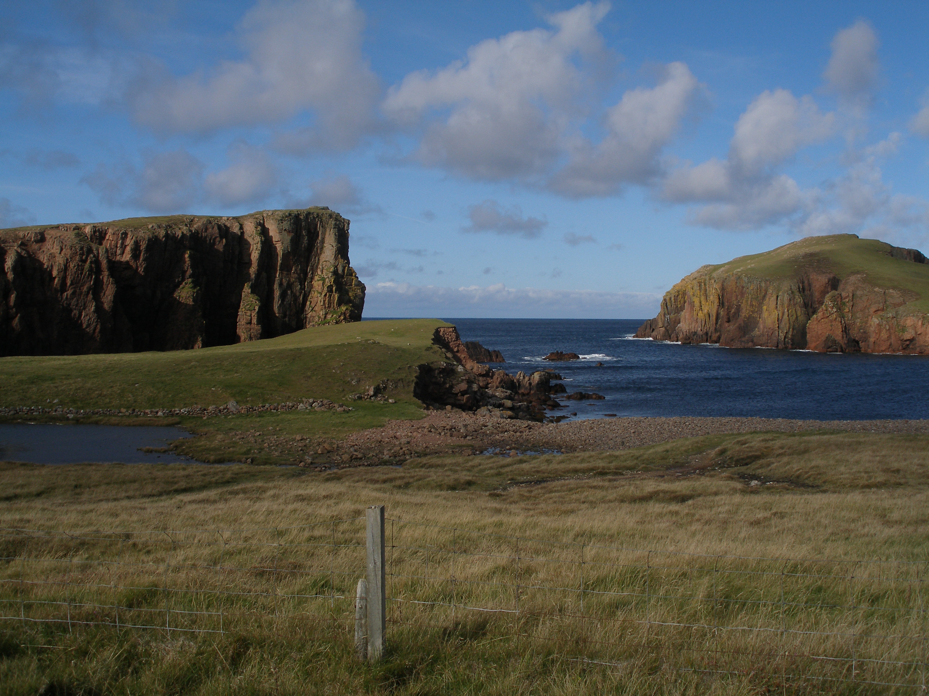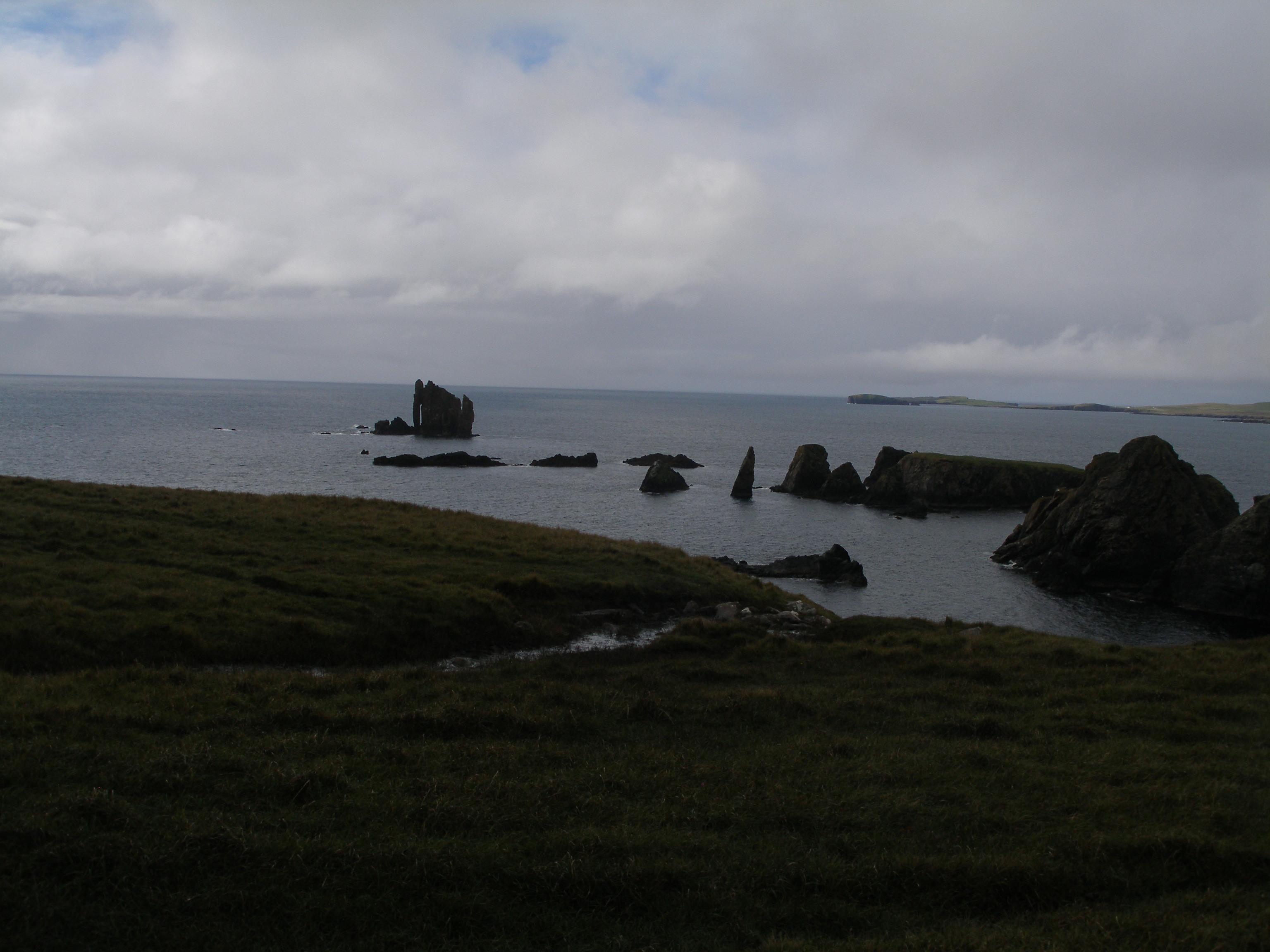A clear bright dawn next morning offered the opportunity to photograph the quintessential Shetland sunrise. John drove us to the north west wing of the main island stopping for us to remark at Mavis Grind with the Atlantic to our left and – a mere stone’s throw away – to the right, the North Sea. Reputed to be a good spot to see otters crossing from one to the other, we were again out of luck. Reaching Hillswick, we hiked for about five miles along the Esha Ness Cliffs to the lighthouse at Baa Taig. Phenomenal geological stacks and strata to admire marked out this hike: cathedral-like island stacks such as the Drongs, the tiny isle of Westerhouse and views north west to the Runk from the Ness cliff tops. The circular hike brought us back to the ornate St Magnus Bay Hotel. We sat in the pristine formal lounge in our hiking boots drinking cups of tea …