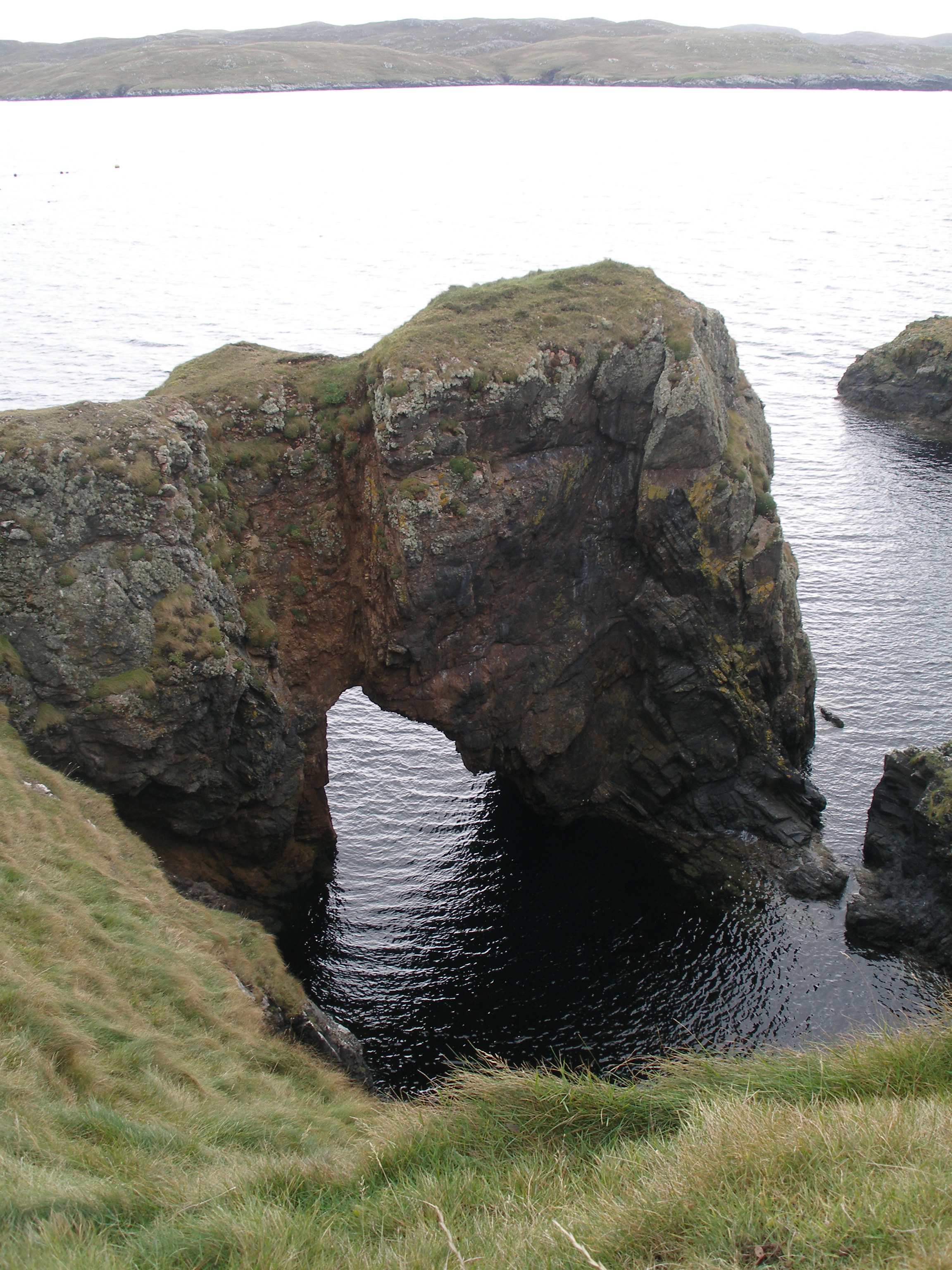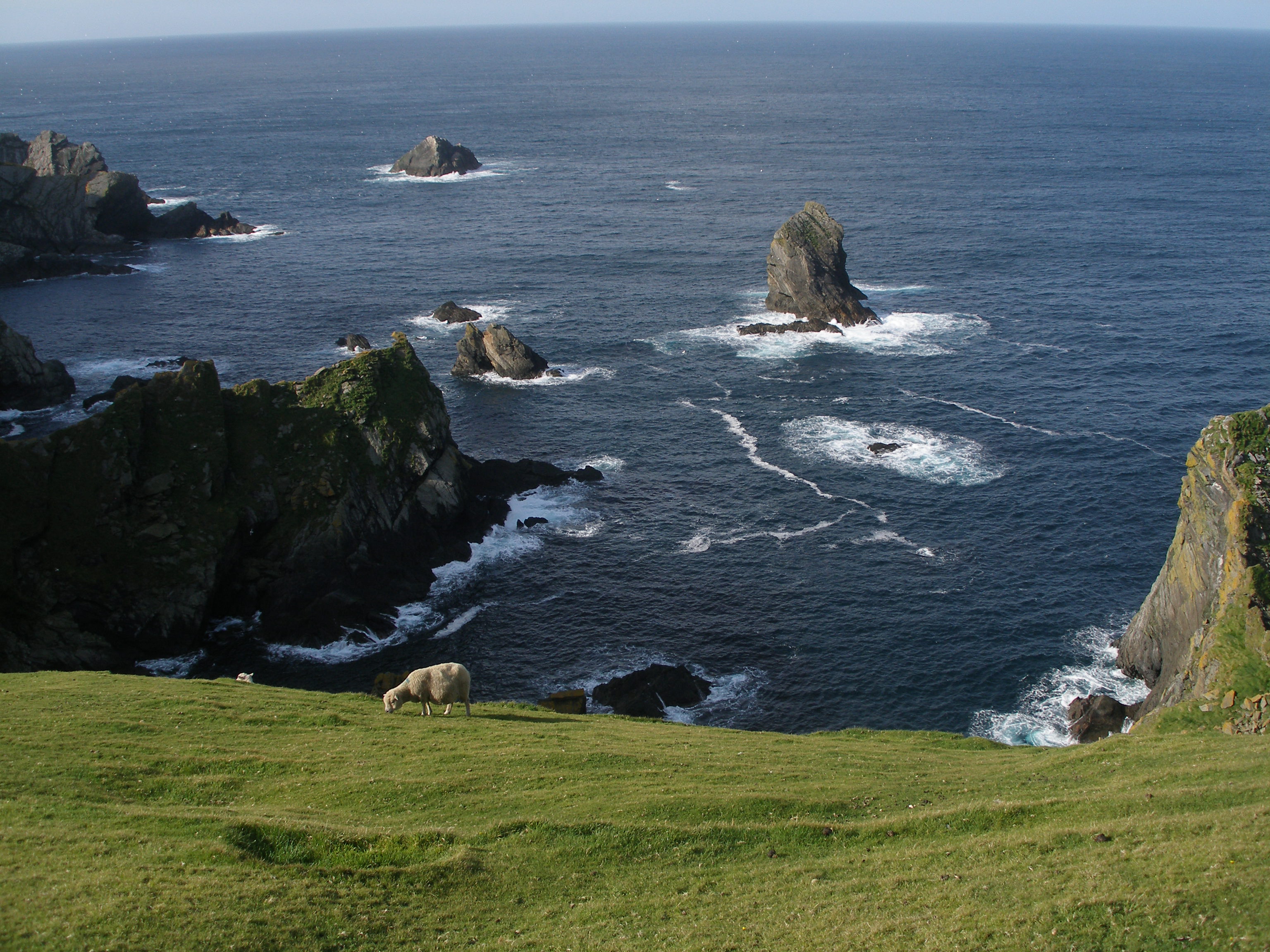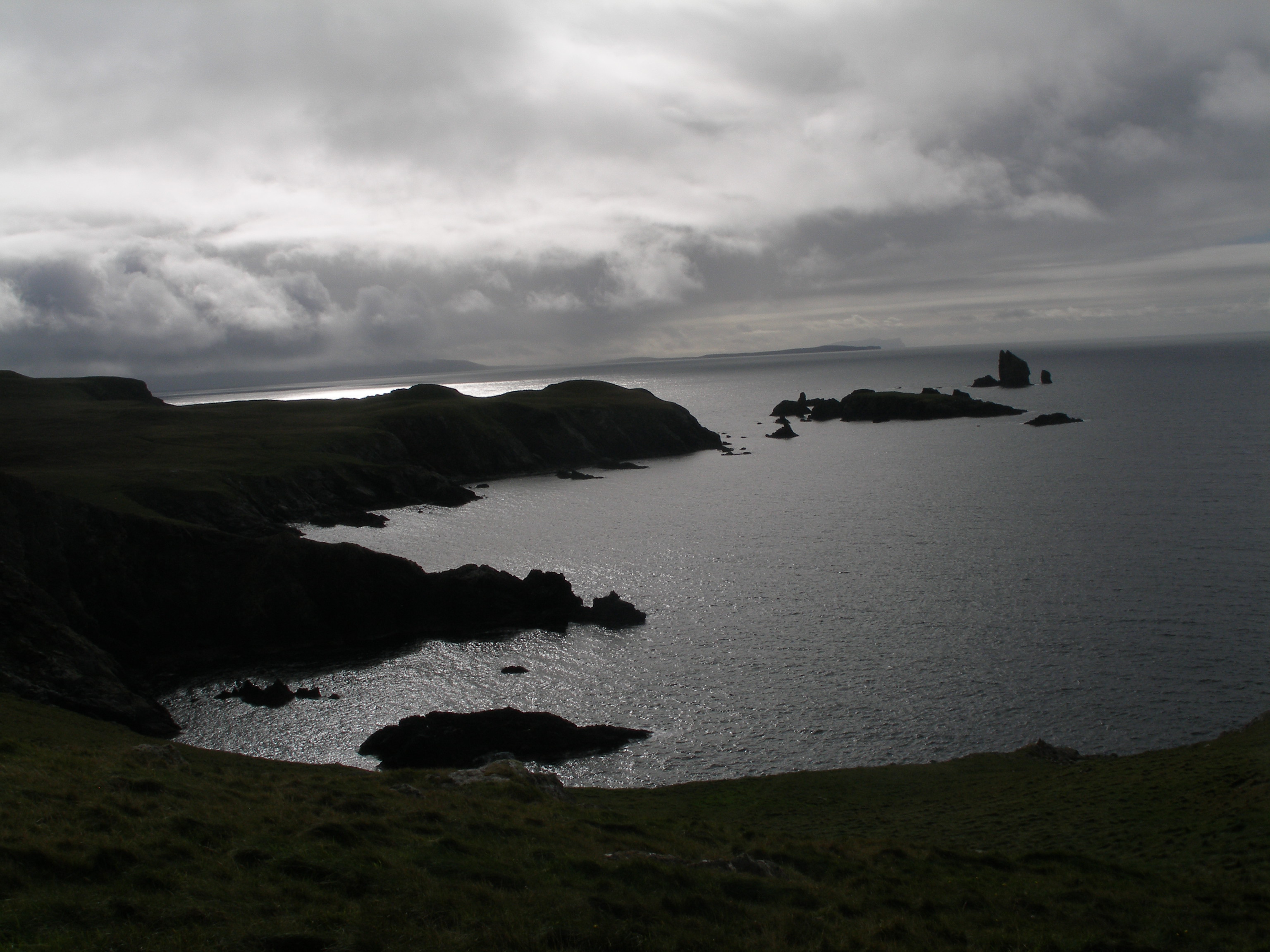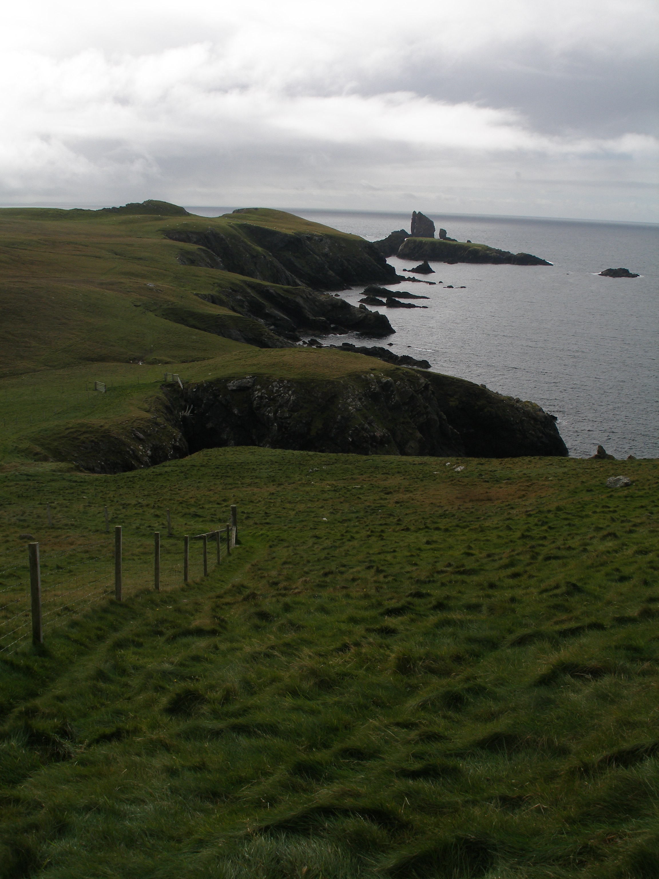 A clear bright dawn next morning offered the opportunity to photograph the quintessential Shetland sunrise. John drove us to the north west wing of the main island stopping for us to remark at Mavis Grind with the Atlantic to our left and – a mere stone’s throw away – to the right, the North Sea. Reputed to be a good spot to see otters crossing from one to the other, we were again out of luck. Reaching Hillswick, we hiked for about five miles along the Esha Ness Cliffs to the lighthouse at Baa Taig. Phenomenal geological stacks and strata to admire marked out this hike: cathedral-like island stacks such as the Drongs, the tiny isle of Westerhouse and views north west to the Runk from the Ness cliff tops. The circular hike brought us back to the ornate St Magnus Bay Hotel. We sat in the pristine formal lounge in our hiking boots drinking cups of tea …