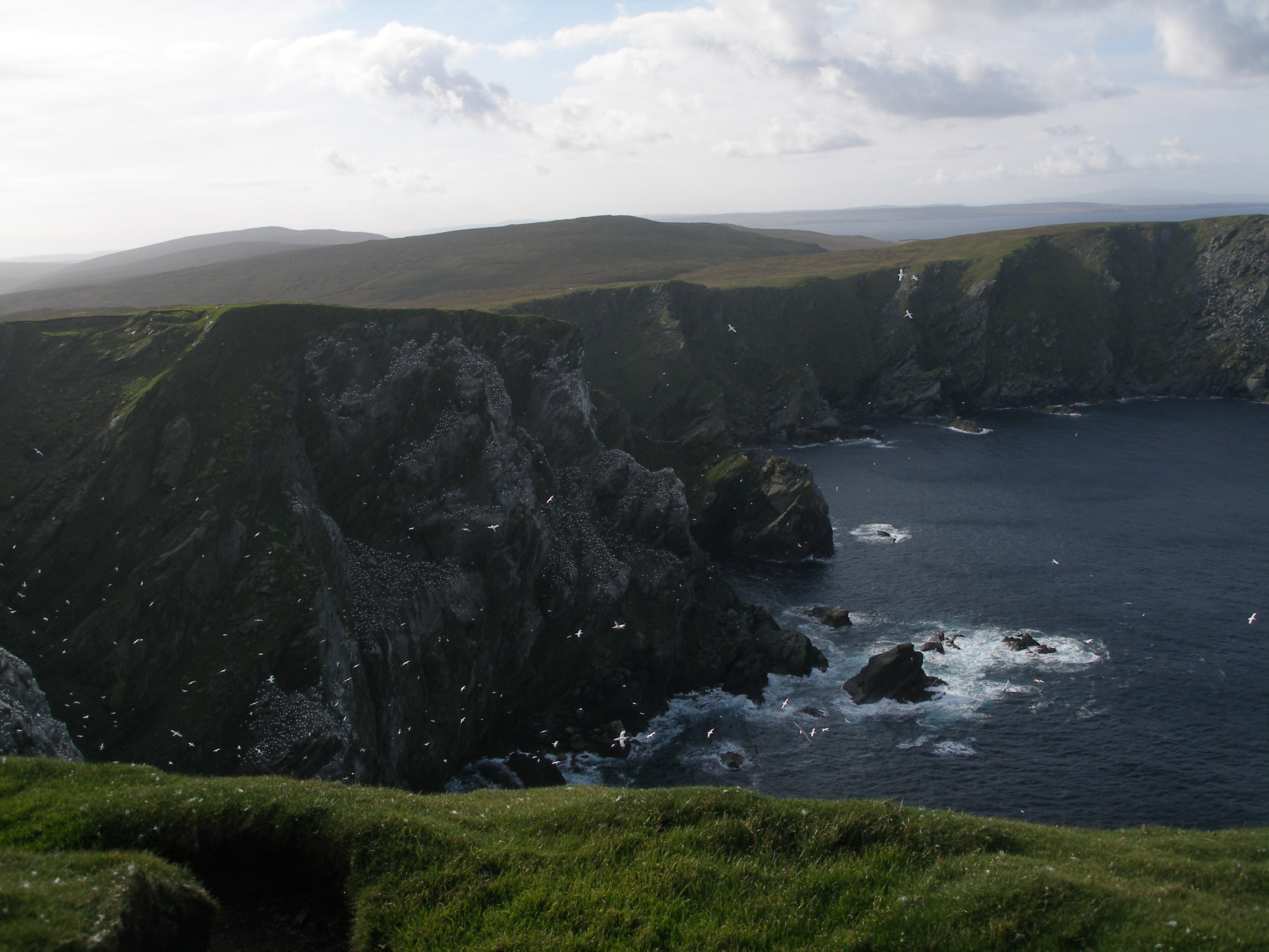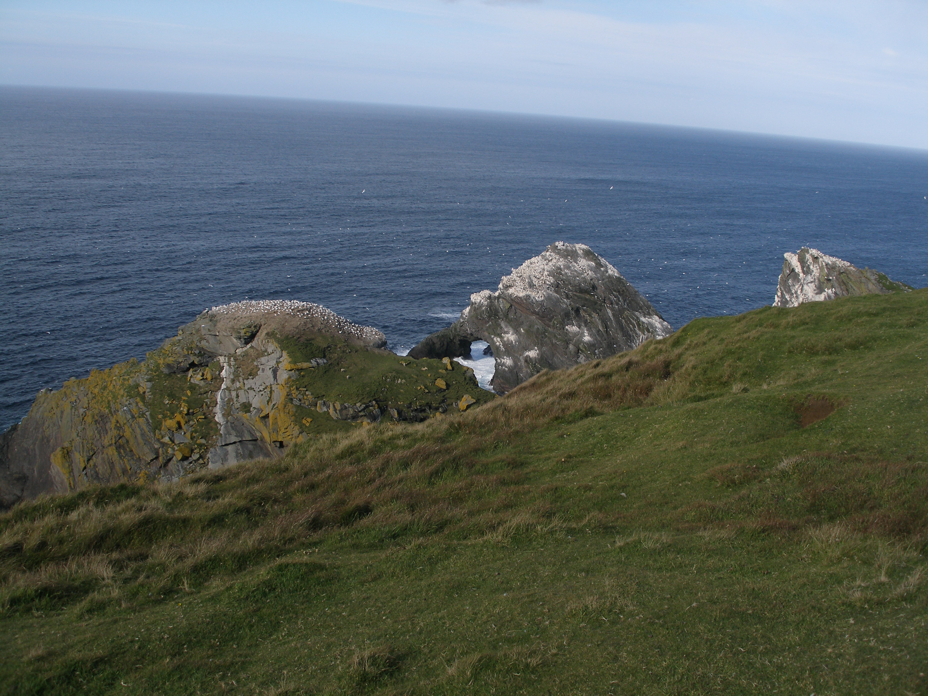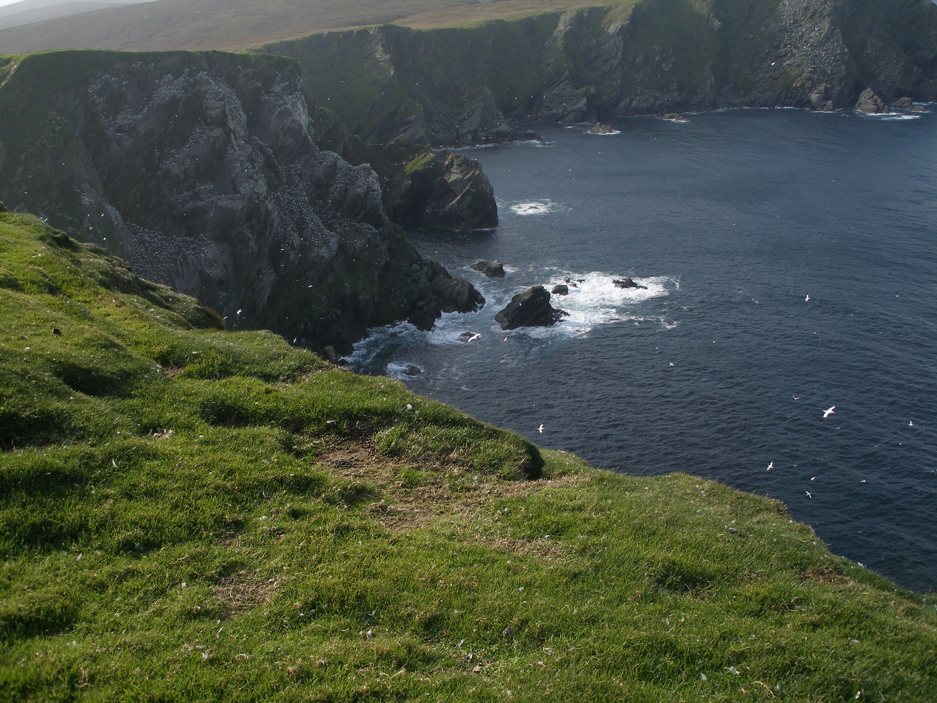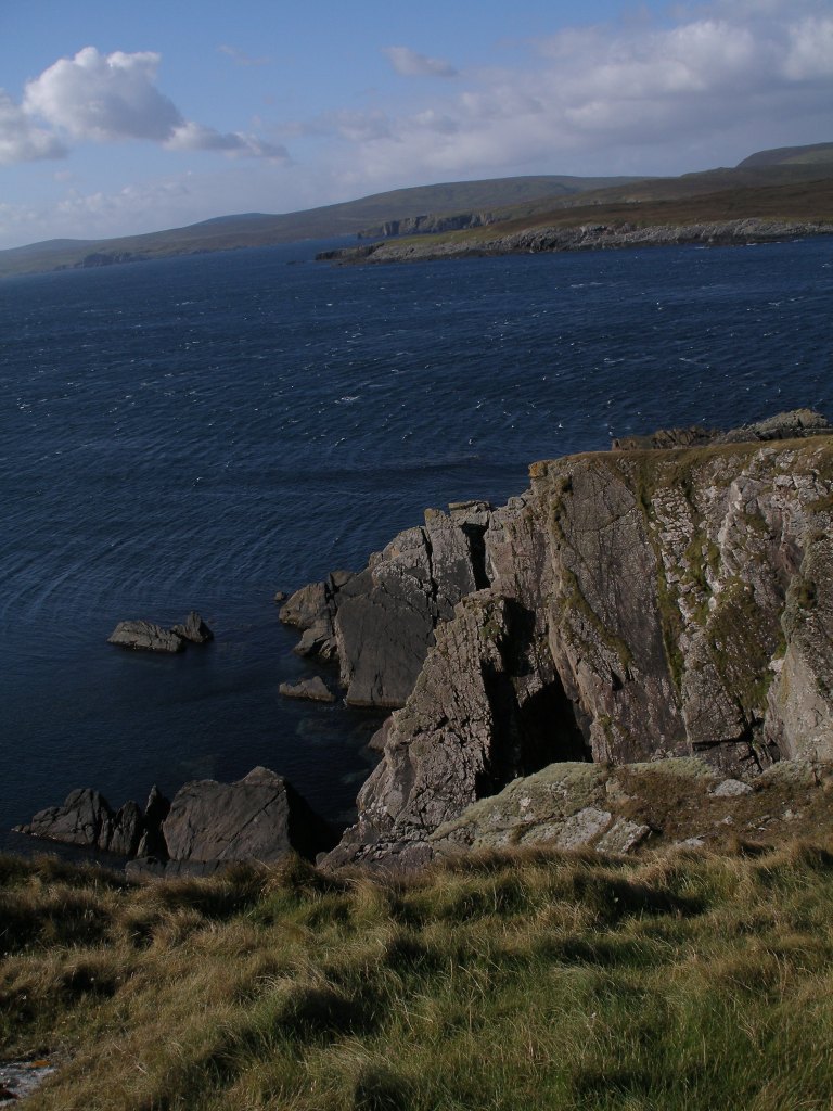 A clear bright dawn next morning offered the opportunity to photograph the quintessential Shetland sunrise. John drove us to the north west wing of the main island stopping for us to remark at Mavis Grind with the Atlantic to our left and – a mere stone’s throw away – to the right, the North Sea. Reputed to be a good spot to see otters crossing from one to the other, we were again out of luck. Reaching Hillswick, we hiked for about five miles along the Esha Ness Cliffs to the lighthouse at Baa Taig. Phenomenal geological stacks and strata to admire marked out this hike: cathedral-like island stacks such as the Drongs, the tiny isle of Westerhouse and views north west to the Runk from the Ness cliff tops. The circular hike brought us back to the ornate St Magnus Bay Hotel. We sat in the pristine formal lounge in our hiking boots drinking cups of tea …