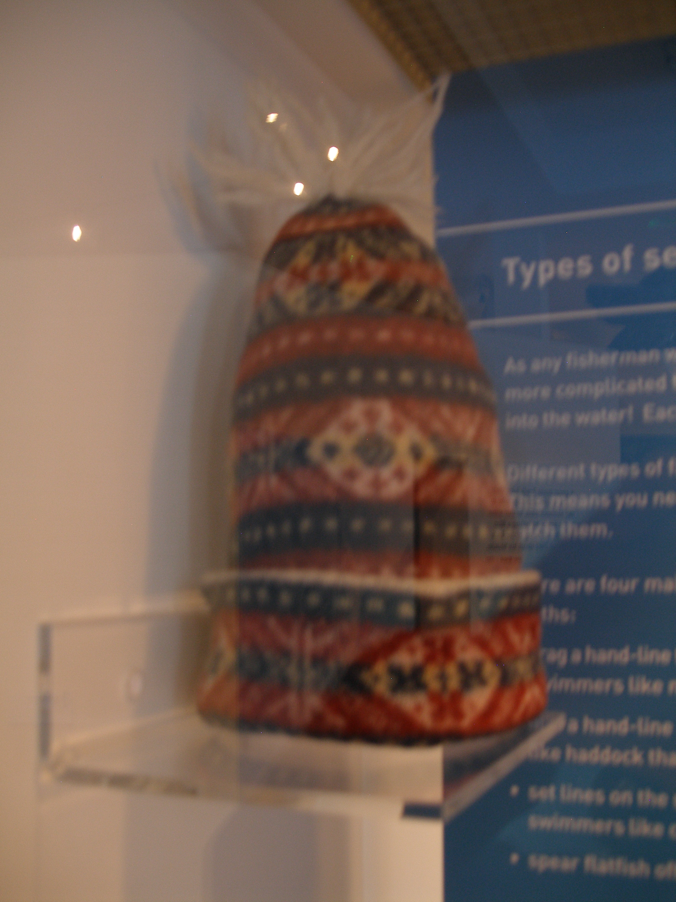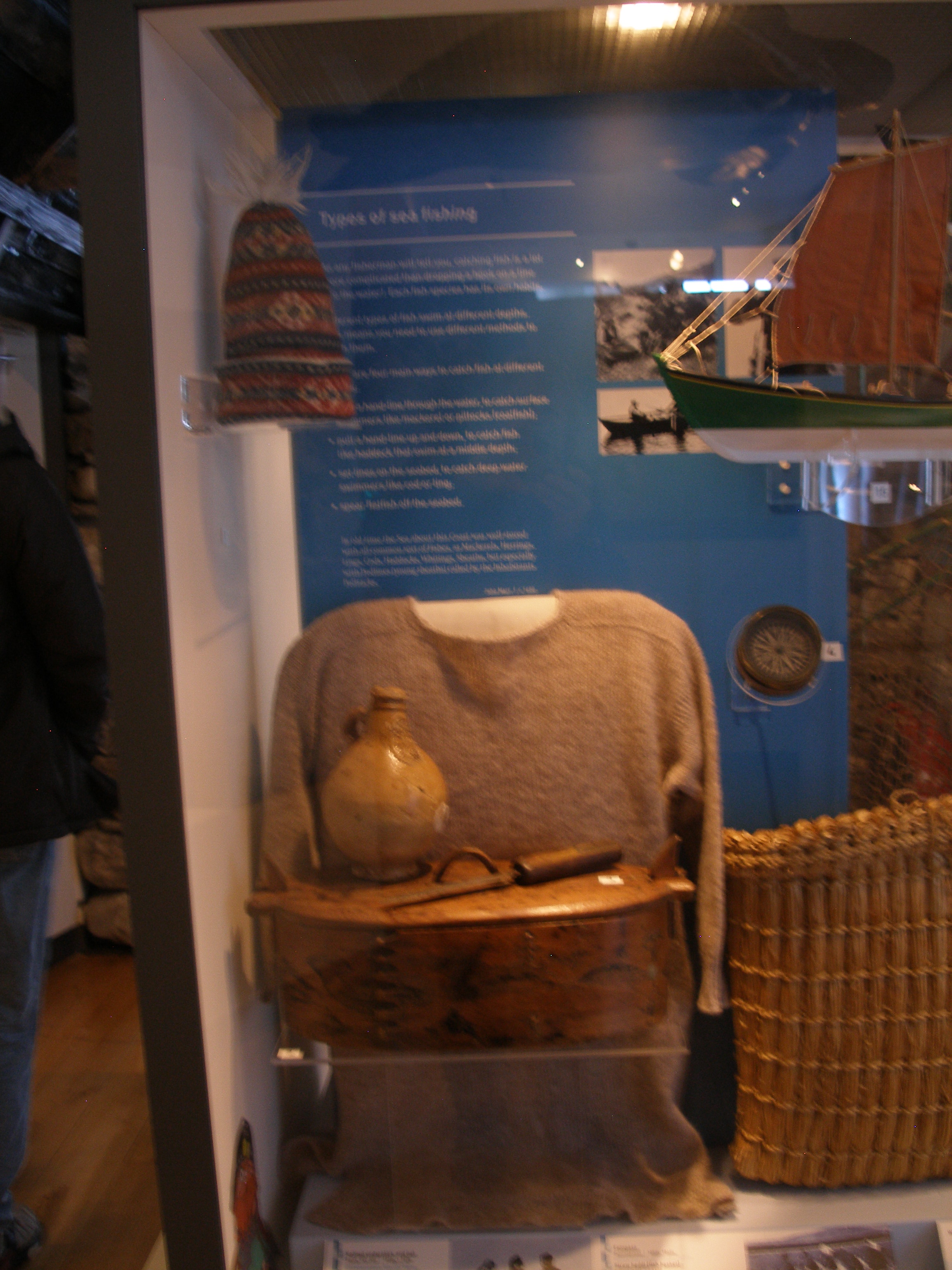 The Knab of my room’s view was our destination for our longer hike on Sunday morning, doubling back into Lerwick in the afternoon to wander past Jimmy Perez’ famous (tv) house, and along the harbourside past massive car ferries heading to Aberdeen and Fair Isle, to the Shetland Museum and Archive. Not only were there superb installations explaining the unique geology of the islands, but also casement after casement showing the history of the textile industry.