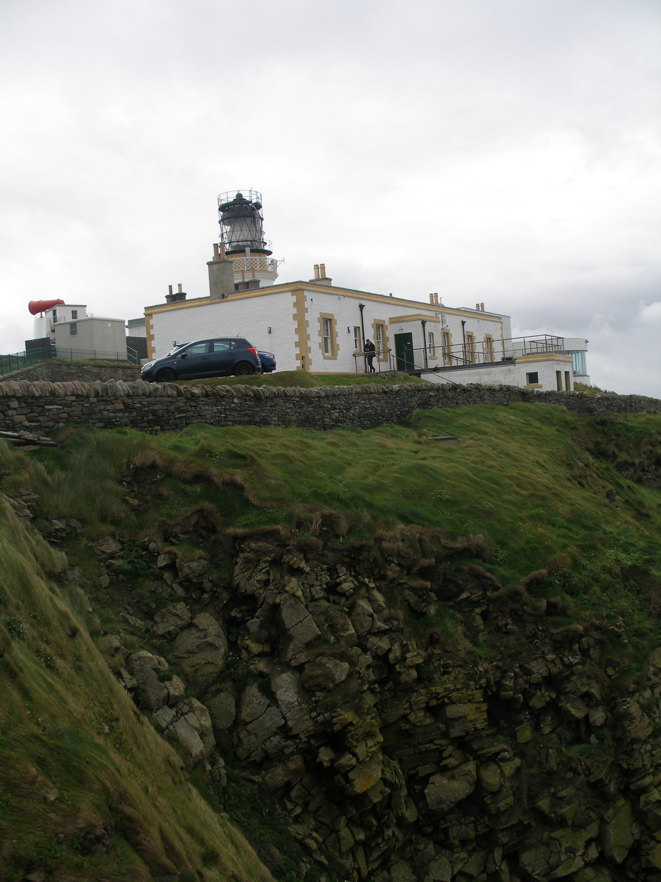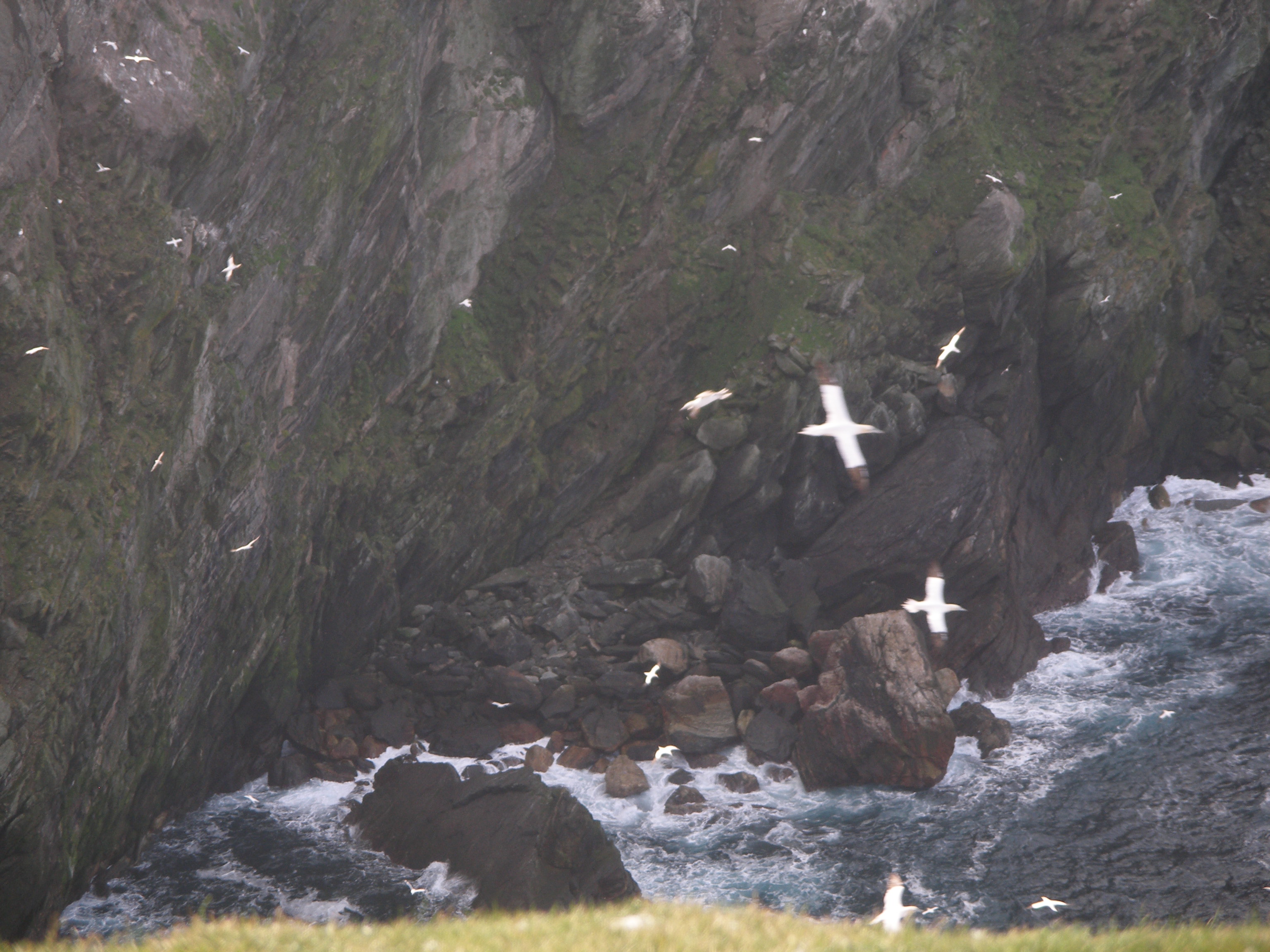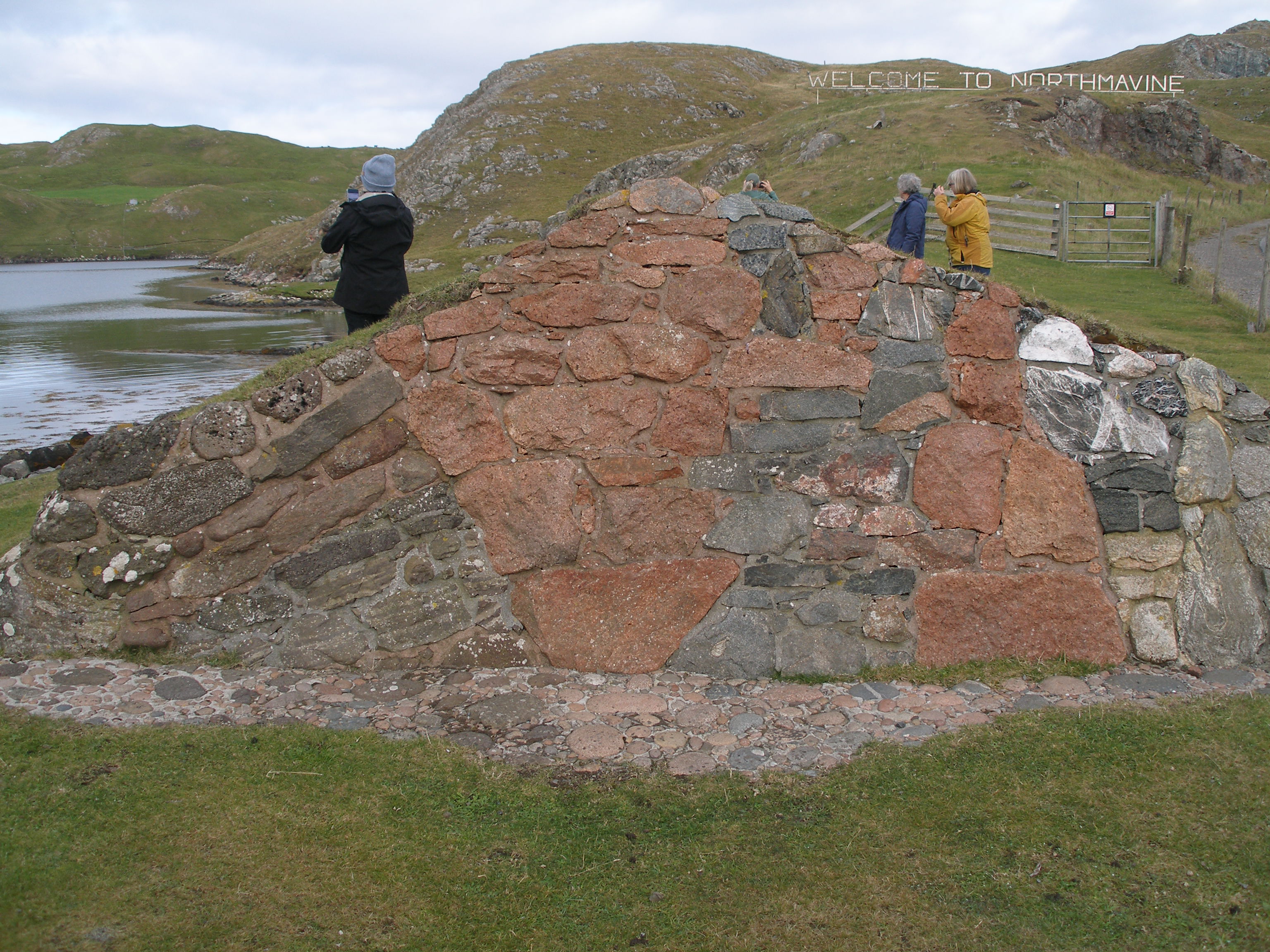On Monday, John – resplendent in another Fair Isle waistcoat – drove us south towards Sumburgh, and dropping us off, left us to explore the extensive Jarlshof Prehistoric and Norse Settlement dating from about 2,700 BC, consisting of Bronze Age houses and smithy; an Iron Age village, broch and an aisled roundhouse; a ninth century Viking longhouse and finally the derelict ruins of a sixteenth century laird’s manor house. Our head’s reeling with time charts, we met up with John and were driven to the Sumburgh Visitor Centre and Nature Reserve, lucky enough to spot a diving Minke whale from the observatory, as well as diving gannets, fulmars (like miniature stiff-winged albatrosses) and dunlins. No otters. The cultivated meadows of this southern, more hospitable region, contained several herds of Shetland ponies to admire, grazing among the ruins of croft cottages.