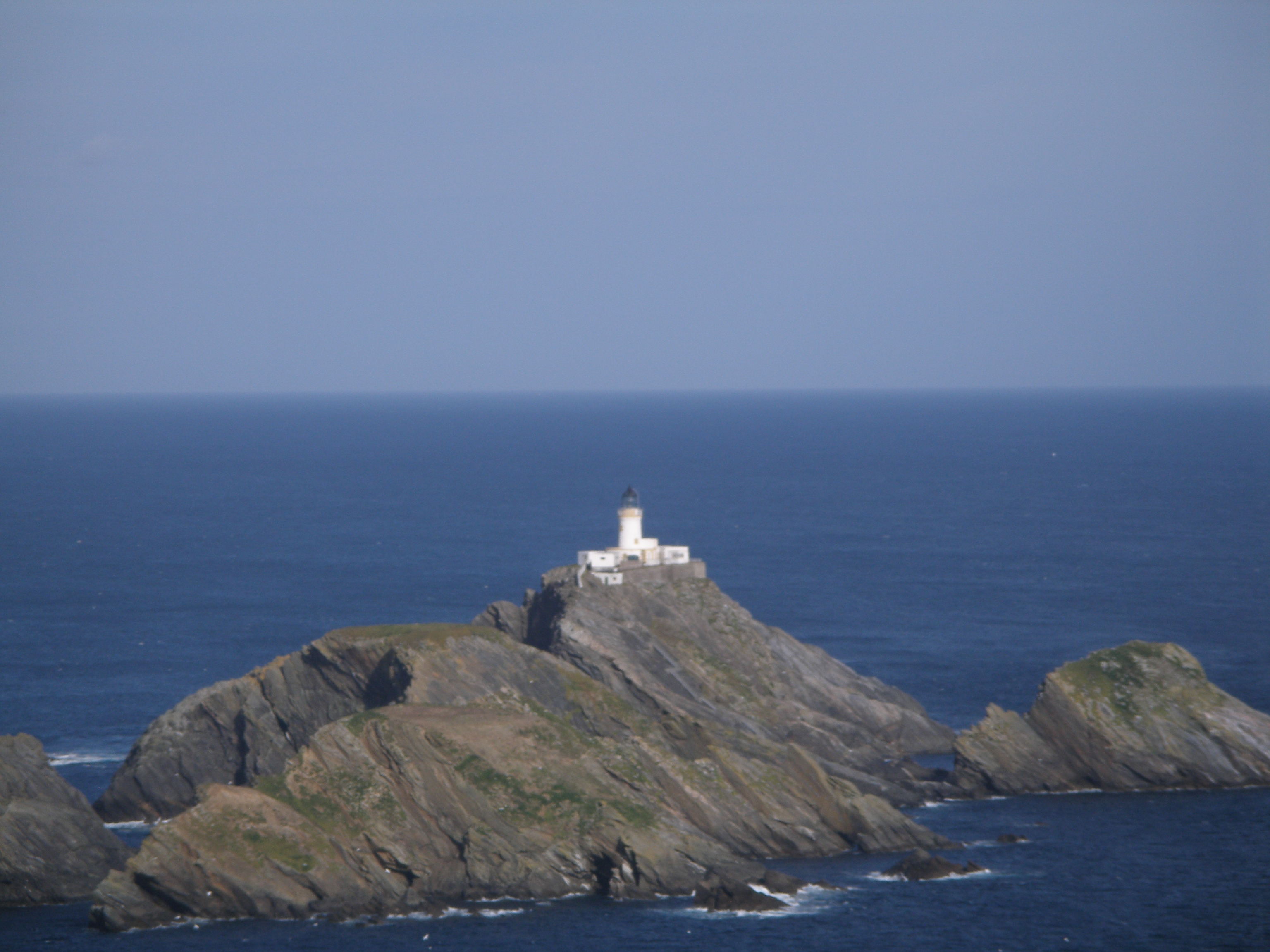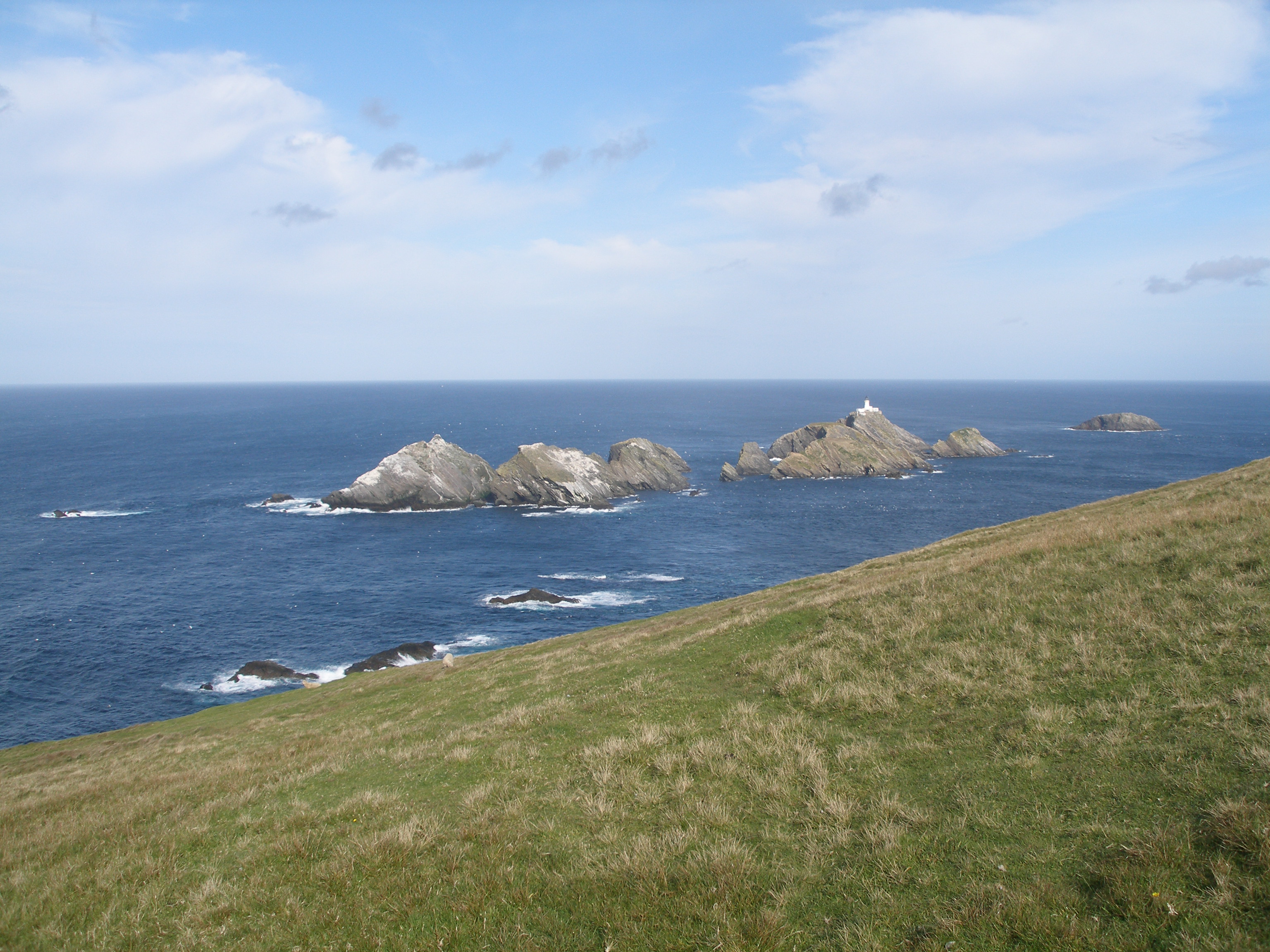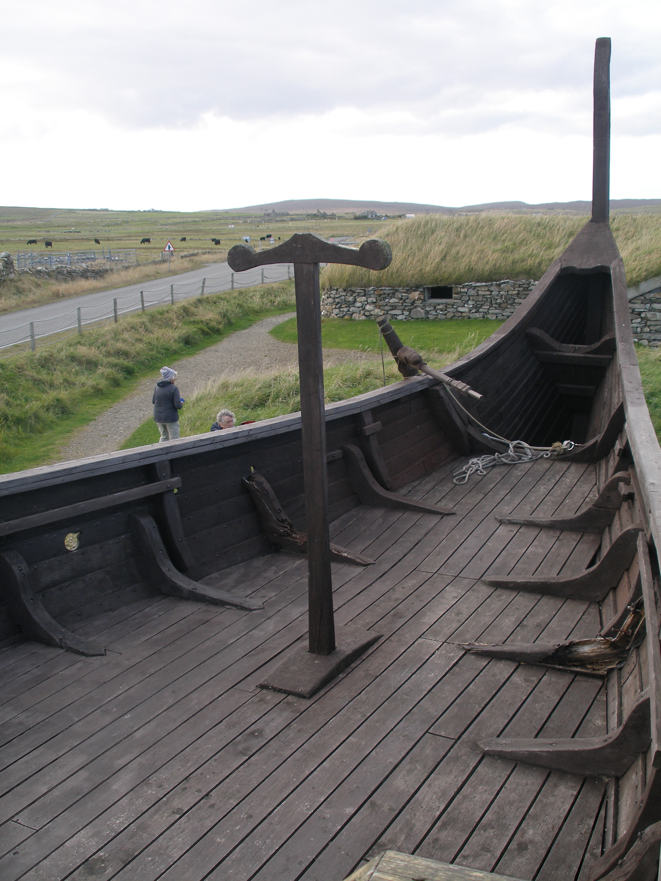 Our penultimate day – scheduled to be a long one of driving north and catching inter-island ferries – was blessed with sunshine. Our goal was to reach the most northerly point of Shetland (and the UK) on the island of Unst. From Toft on the main island we caught an early ferry to the island of Yell, drove north across it to the jetty at Gutcher and then caught another ferry to Unst, where we continued driving north to Hermaness Nature Reserve. Here we were to marvel at the teeming gannet colonies turning the grey rock faces white, drowning out the sound of the breaking swells with their cries. We hiked the cliff paths to view craggy Muckle Flugga Outstack and its solitary lighthouse before walking back into Unst to tour the excellent Heritage Centre (more superb textile displays!) and climb up into the replica Viking longboat beached nearby.